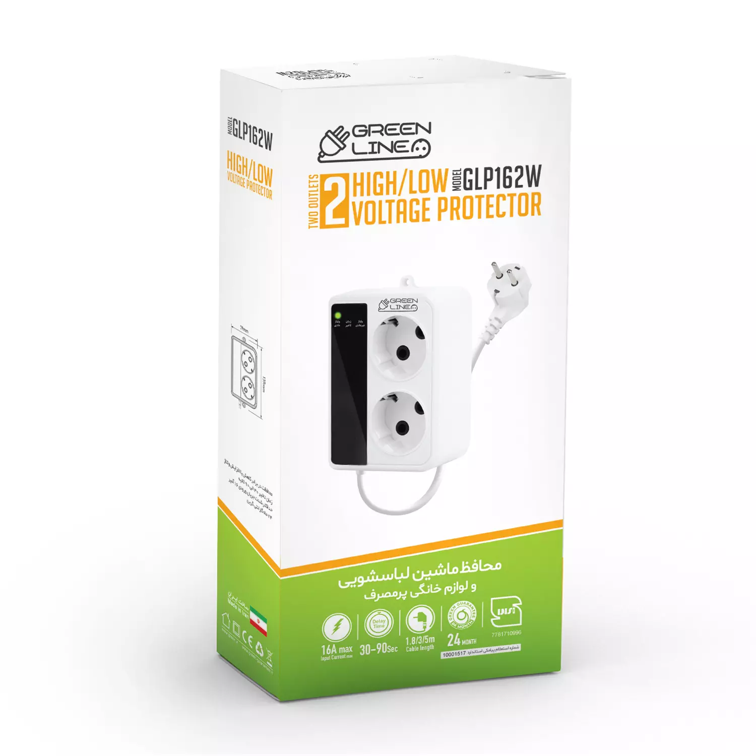 مشخصات فیزیکی محافظ برق لباسشویی GLP162W برند GREEN